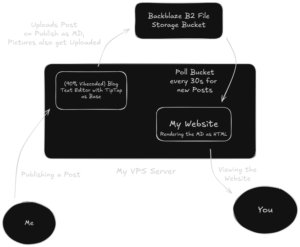 I didn't want to rely on my homeserver for the hosting of the data on my blog because I don't wanna lose all my blogs data if it gives out, in the end, I build a working, but kinda weird solution with an S3 Bucket. (an easy storage solution originally made by Amazon) I used the Blackblaze B2 service for this, as its very cheap and reliable. This is how it works: